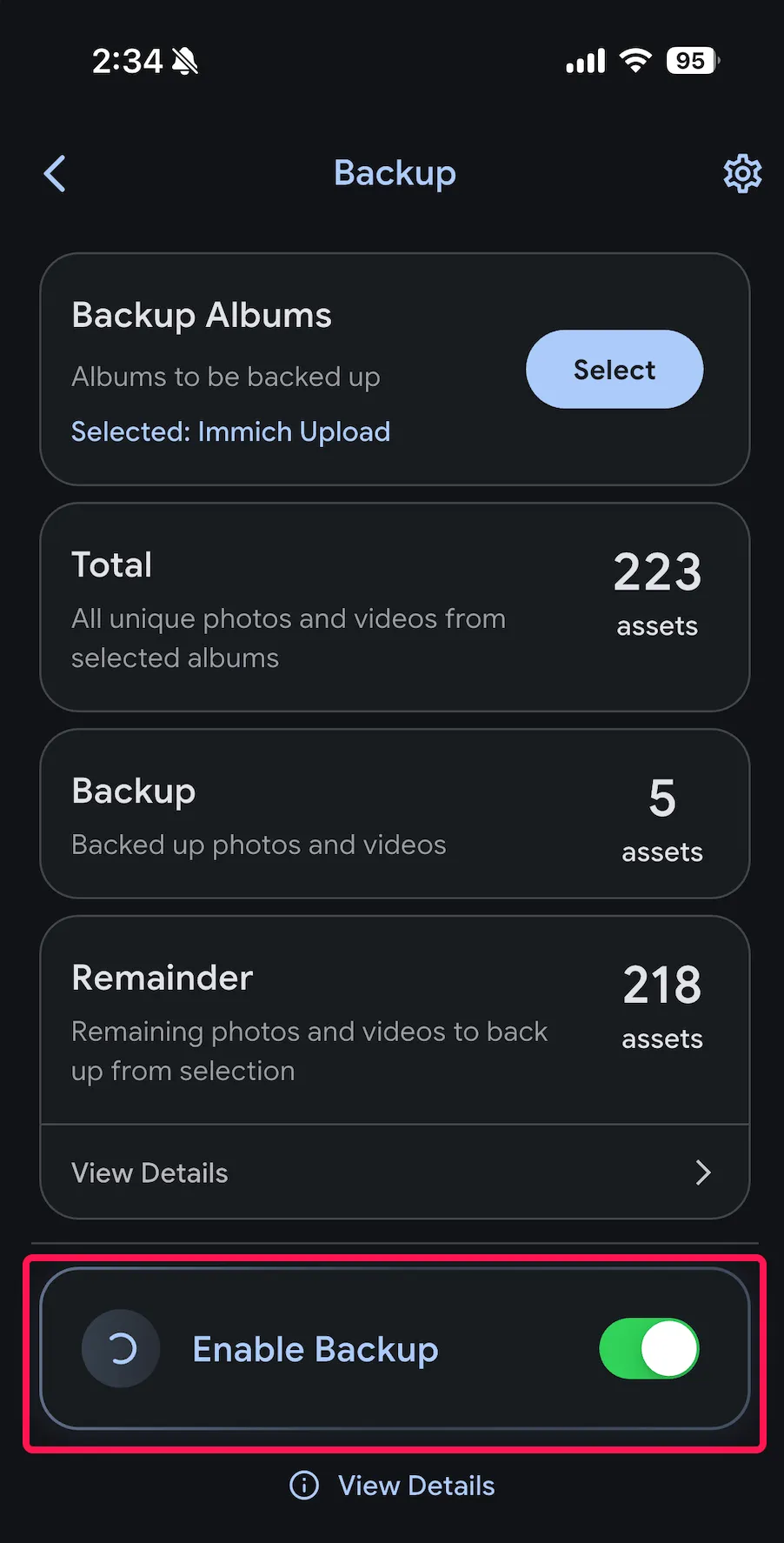 When backup is enabled, Immich will upload new photos and videos from selected albums when you open or resume the app, as well as periodically in the background.