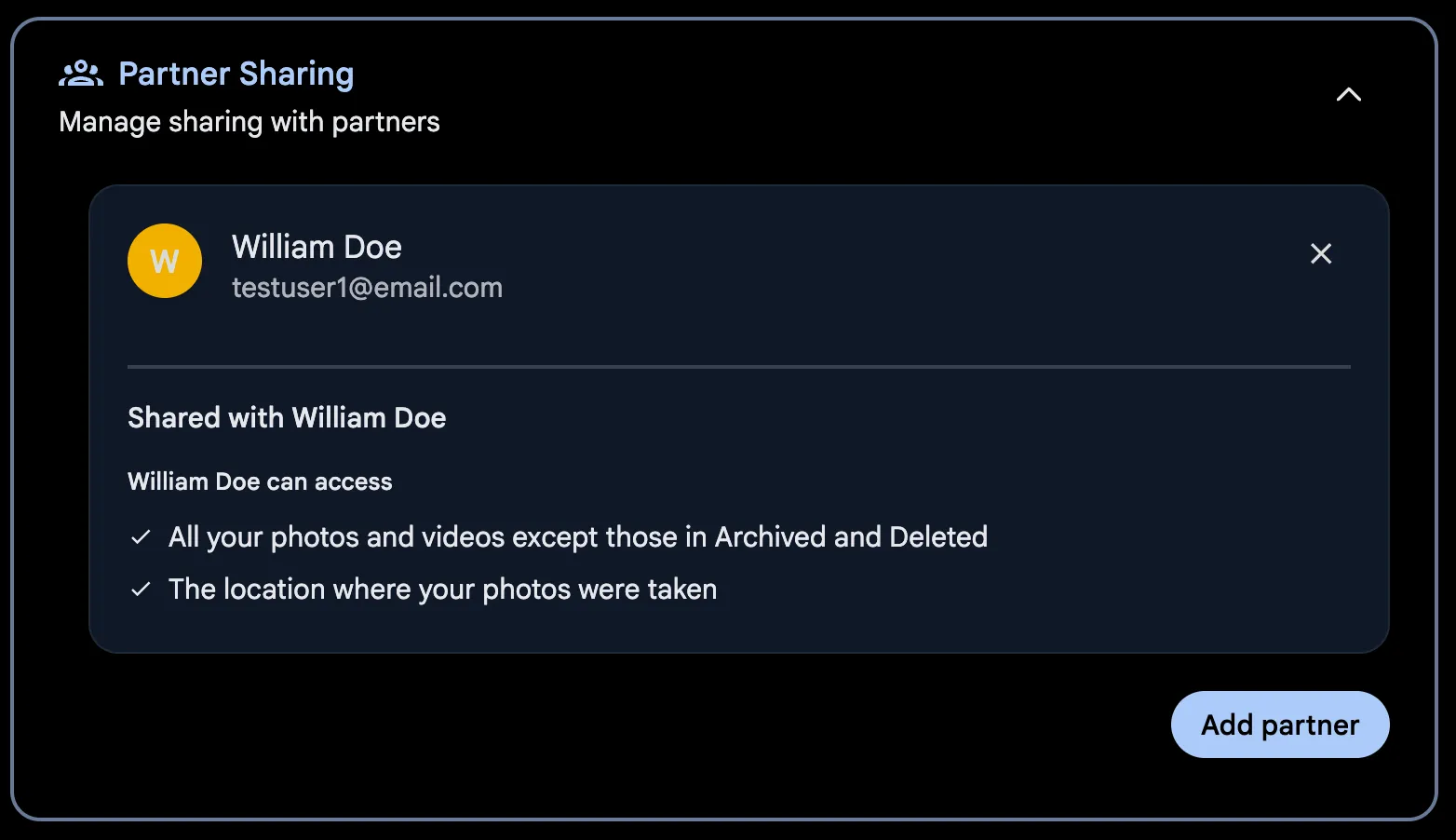- Partner sharing is one-way. To view your partner's assets, they must also share them with you.