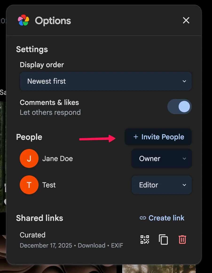After creating an album, you can access the sharing options by clicking on the share icon. When sharing an album, you can select the users you want to share the album with and assign them permissions either as editors (read-write) or viewers (read-only).